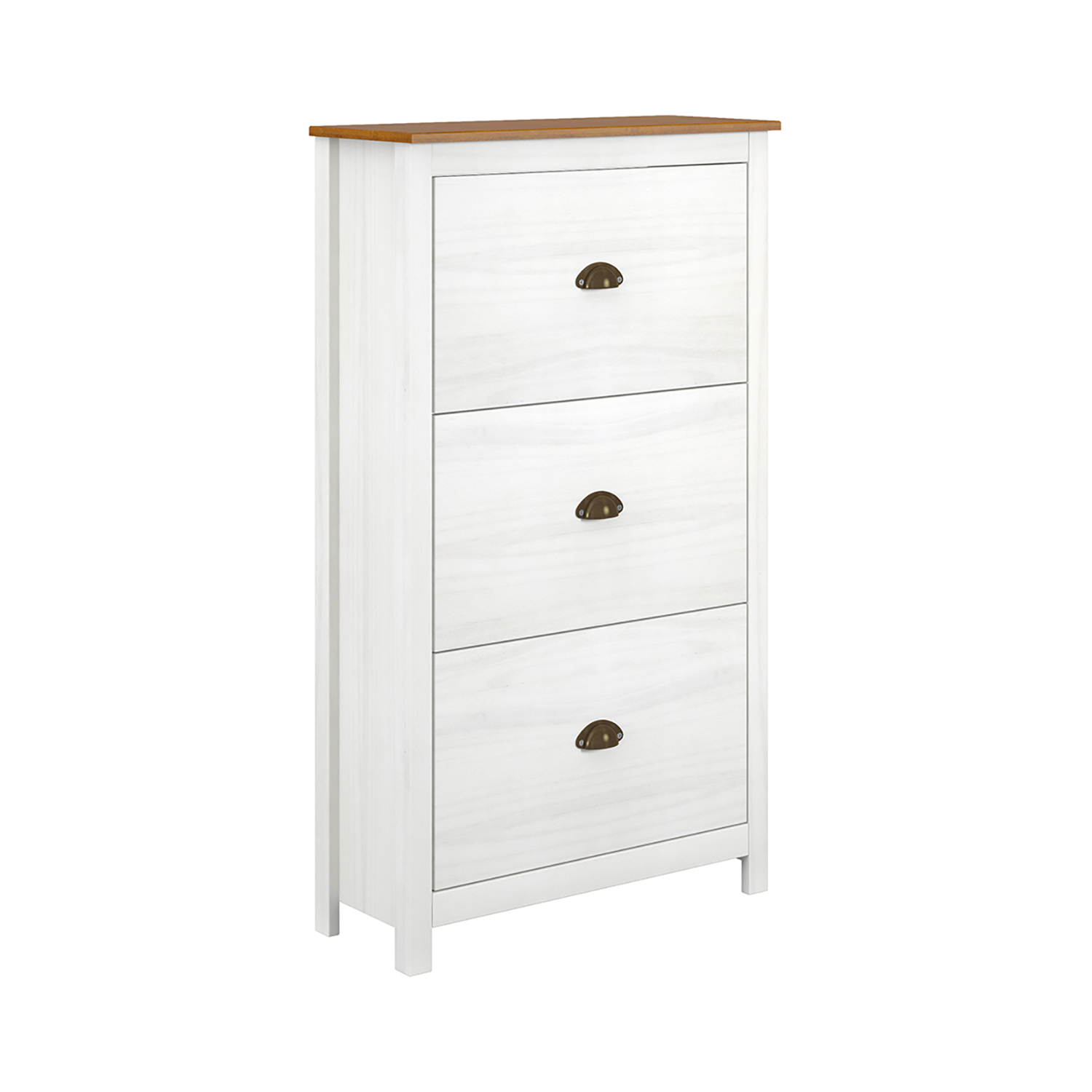 Botník TOPAZIO v provedení masiv borovice, v barevném provedení bílý/hnědý lak se třemi dvouřadými výklopy s kovovými úchytkami pojme hodně párů bot. Úzký botník s výklopy je prostě velice povedeným řešením jak vybavit vaši předsíň.