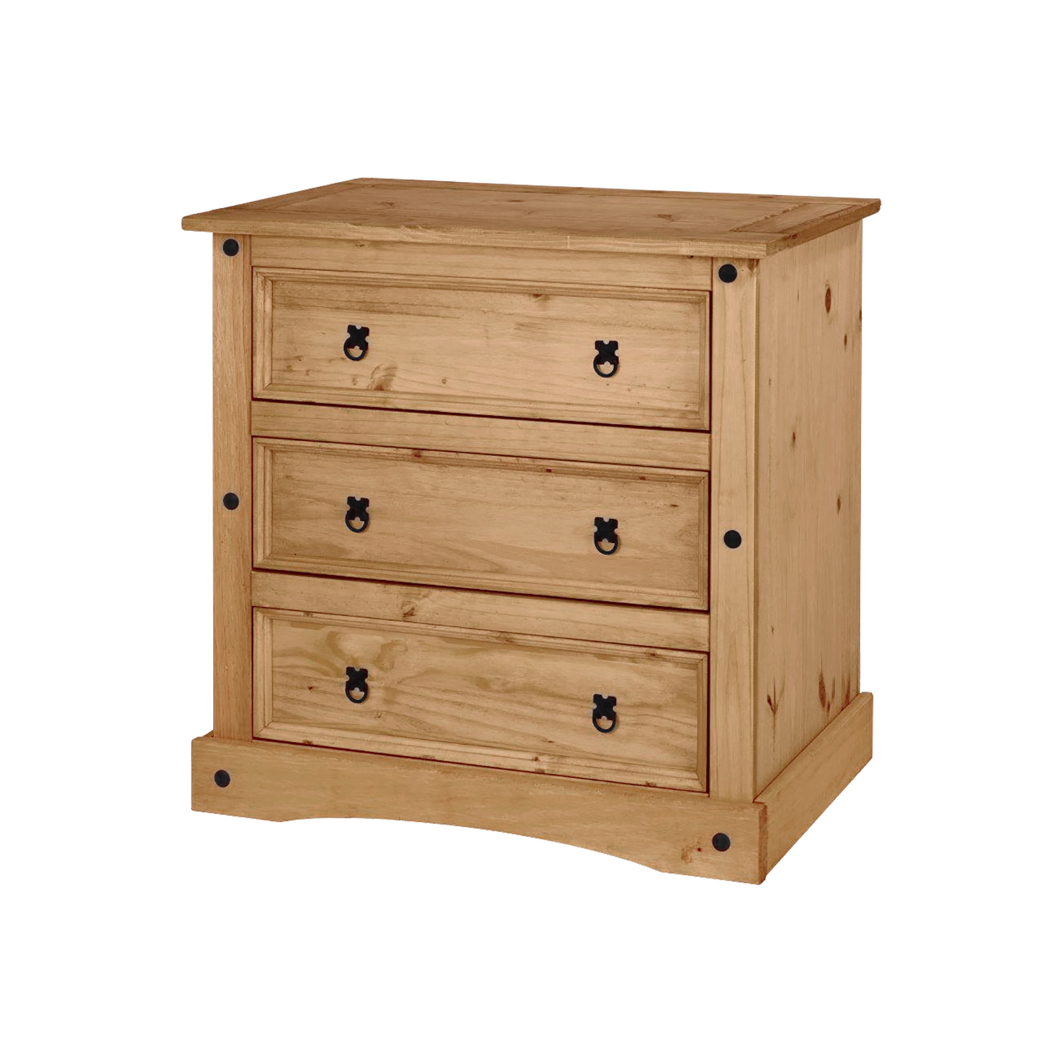 Komoda 3 zásuvky CORONA 3 masivní borovice v medovém odstínu je vybavena 3 zásuvkami a ozdobnými úchytkami v černé barvě.