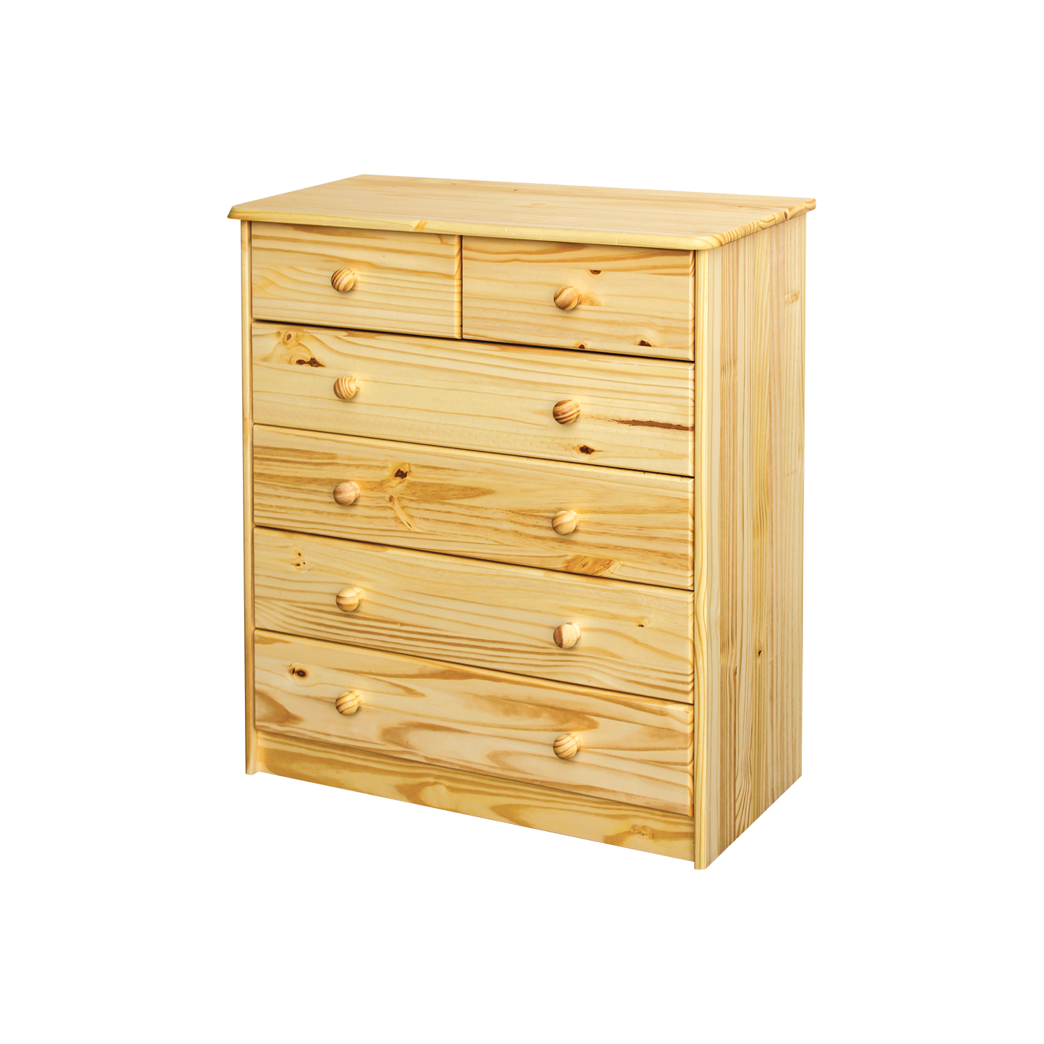 Komoda v provedení masiv borovice obsahuje dvě úzké a čtyři široké zásuvky s kovovými pojezdy.
