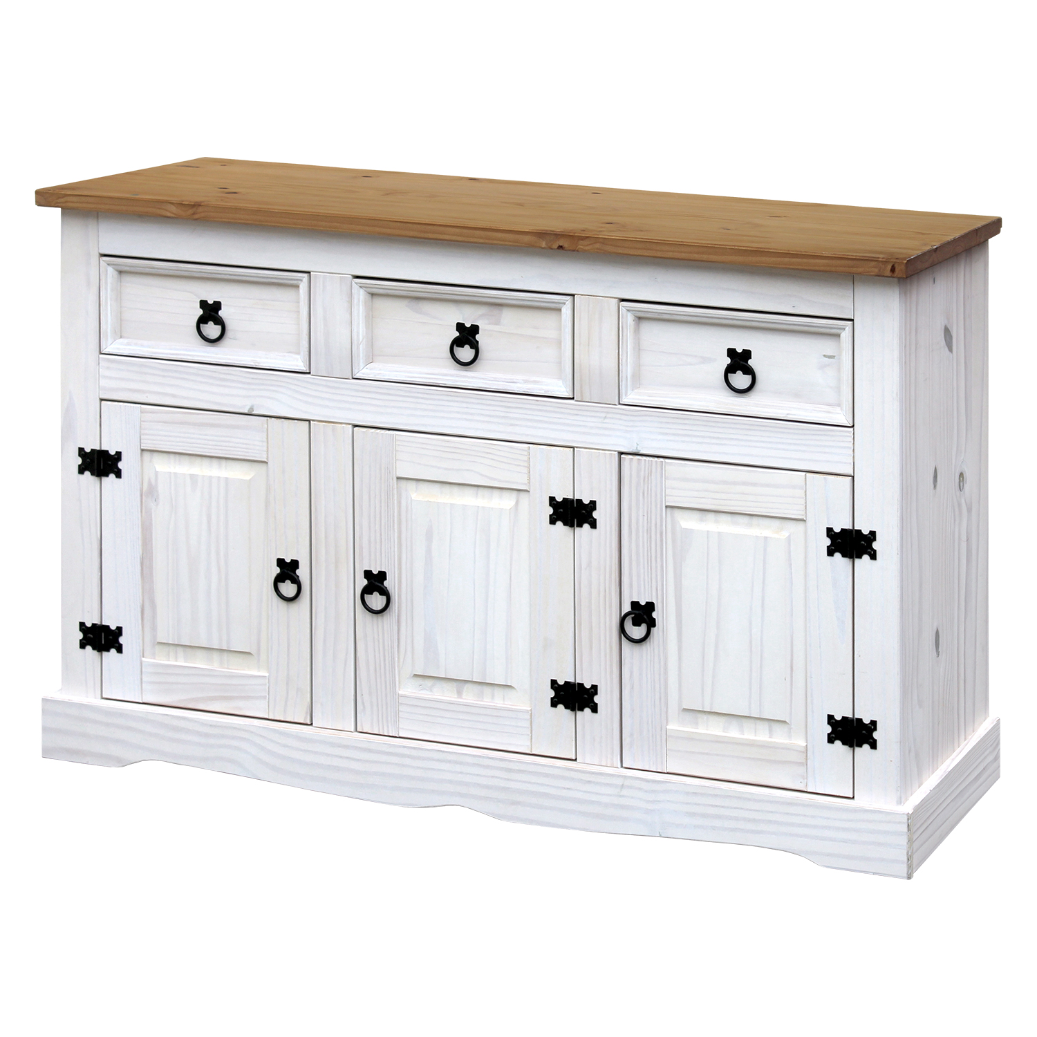 Komoda CORONA v provedení masiv borovice v bílém odstínu s hnědou vrchní deskou nabízí tři zásuvky a stejný počet dvířek, za kterými se nachází velký prostor opatřený policí, komoda je dělena na jeden úložný prostor a tři zásuvky.