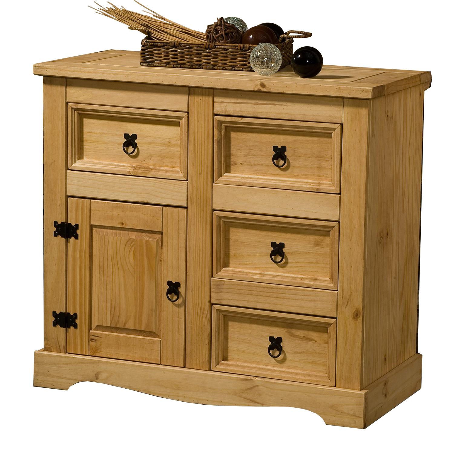 Komoda CORONA v provedení masiv borovice je voskována v krásném medovém odstínu. Komoda obsahuje čtyři malé zásuvky a prostor opatřený dvířky.