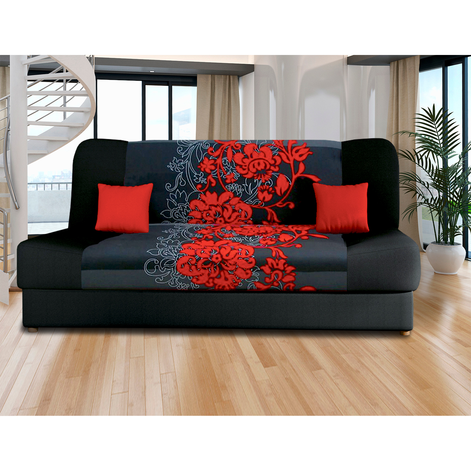 textilní potah, barevné provedení černá / šedá / červená světlejší pruh a motiv květů na sedací a opěradlové části může být umístěn i v jiné poloze, než je na obrázku jádro z vlnité pružiny, výška sedu 40 cm, hloubka sedu 55 cm, rozměr rozložené 190 × 120 cm rozkládací s úložným prostorem, rozkládání KLIK-KLAK (postup uveden v návodu k montáži) po složení do polohy k sedu upravte krycí látku v zadní části tak, aby zakryla rozkládací mechanizmus
