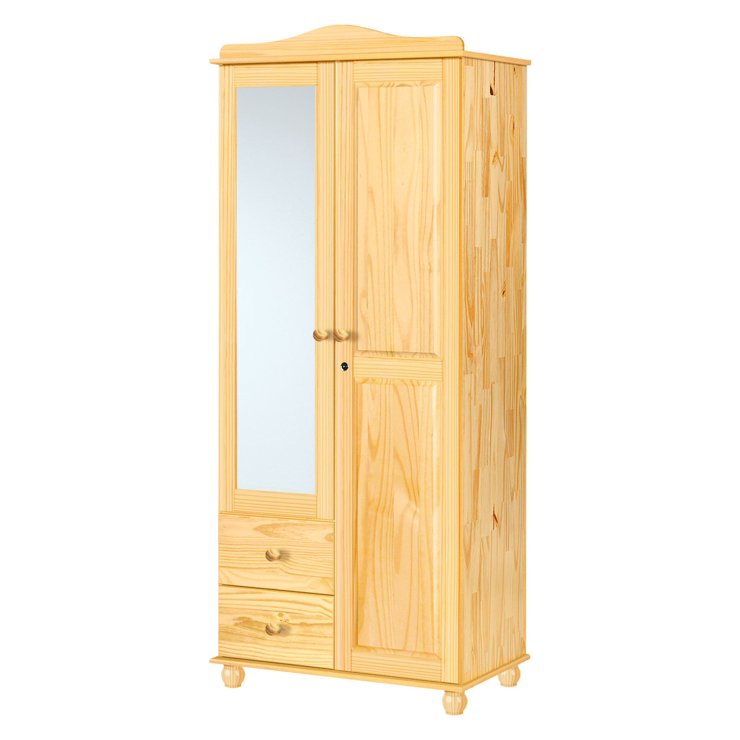 Skříň 2dveřová GRAND PRIX v provedení masiv borovice, lak se bude hodit do ložnice i šatny. Skříň lze umístit samostatně nebo po boku skříní GRAND PRIX. Skříň má prostor dělený na poloviny, v pravé části naleznete čtyři police, v levé části dveře se zrcadlem, uvnitř je kovová šatní tyč, dole dvě zásuvky s kovovými pojezdy. Do skříně tak pověsíte, poskládáte i uložíte všechny vaše věci včetně spodního prádla. Do skříně lze navíc umístit i nejrůznější krabice a boxy na doplňky a drobnosti. Masivní nábytek vypadá vždy velice dobře, skříň lze postavit jak do ložnice, tak do dětského pokoje či šatny.