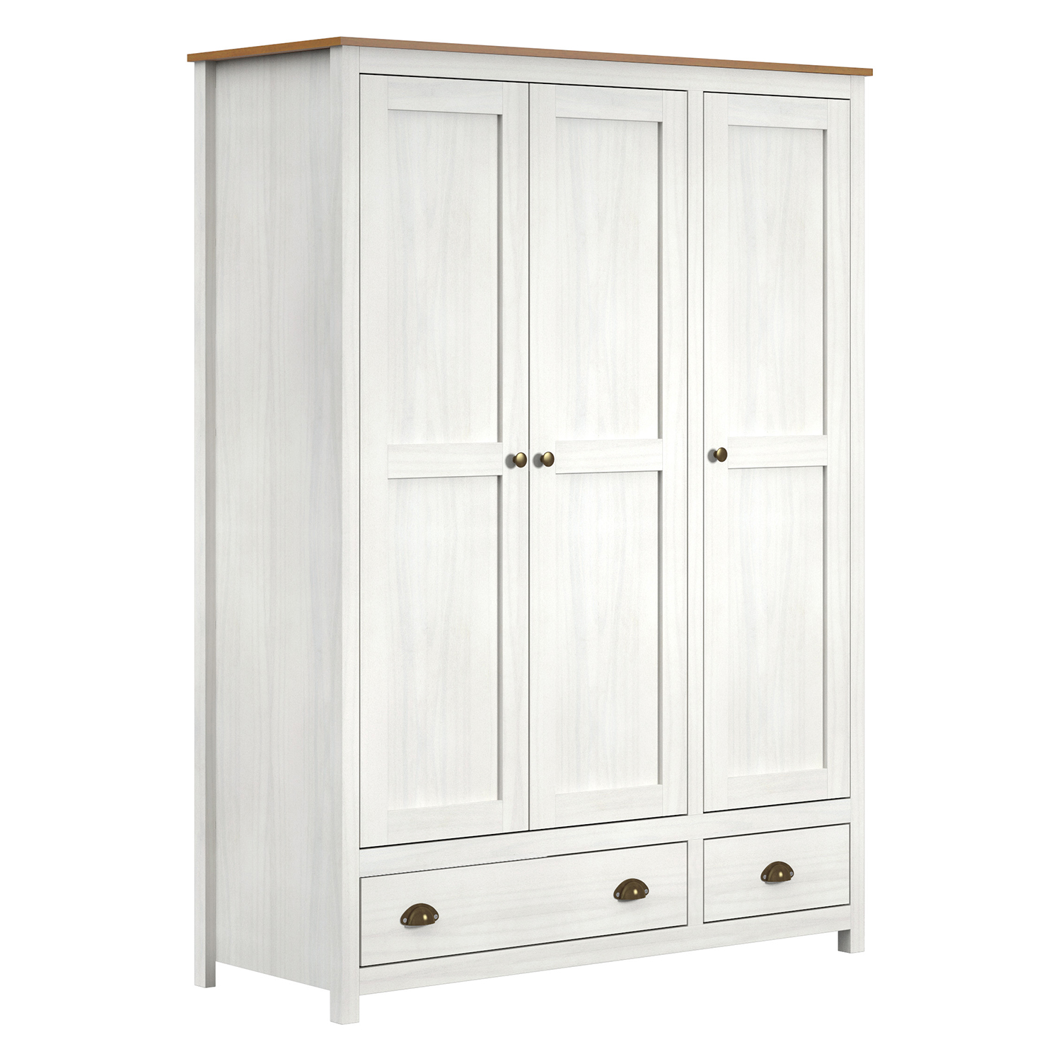 Skříň 3dveřová TOPAZIO v barevném provedení bílý/hnědý lak bude v ložnici vypadat naprosto perfektně a její rustikální design zaujme na první pohled. Bílá skříň s hnědou vrchní deskou a kovovými úchytkami pojme opravdu hodně oblečení. Skříň TOPAZIO totiž z větší části obsahuje prostorné police, v užší části pak naleznete polici a kovovou šatní tyč. Skříň dělena v poměru 2:1 tedy bude stačit na celou vaši garderobu. Oblečení bude přehledně poskládáno v policích a v levé části pověsíte bundy, kabáty a košile, úzká police pak pojme pokrývky hlavy či jiné doplňky. Ve spodní části skříně se nachází dvě zásuvky s kovovými pojezdy k uložení spodního prádla a ručníků.