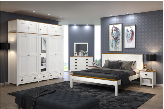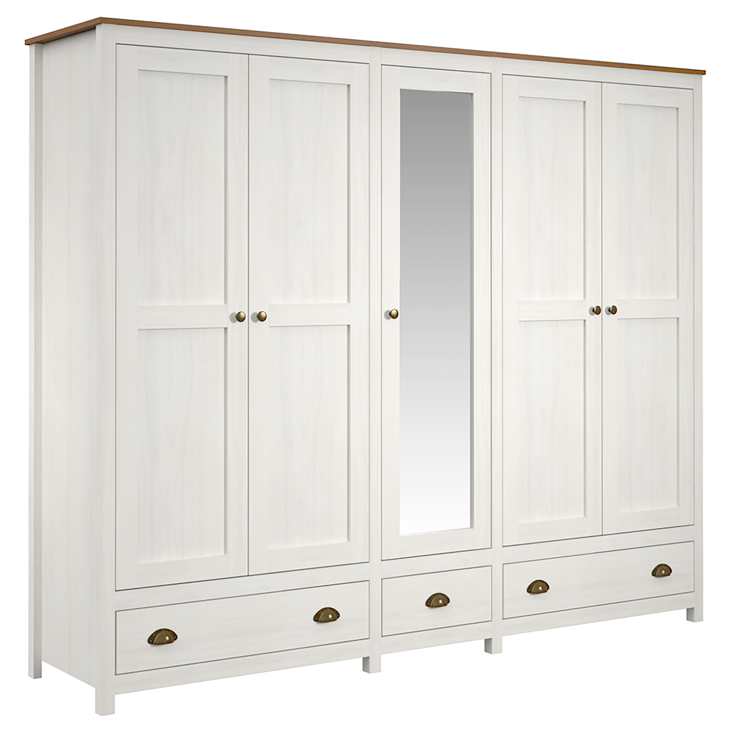 Skříň 5dveřová TOPAZIO v barevném provedení bílý/hnědý lak bude plnit svůj prvořadý úkol, a to umístění veškerého oblečení, velice svědomitě. Skříň 5dveřová TOPAZIO v provedení masiv borovice zaujme svoji pozici jak v ložnici, tak v šatně. Nejlépe si bude rozumět s dalším masivním nábytkem s označením TOPAZIO. Velkou bílou skříň pětidveřovou zdobí kovové úchytky. Moderní skříň nabízí v levé části tři police, ve střední části a pravé části se pak nachází police jedna a kovová šatní tyč. Na středních dveřích je pak vysoké zrcadlo. Ve spodní části skříně naleznete tři zásuvky s kovovými úchytkami a pojezdy na prádlo či doplňky. Pětidveřová skříň uloží oblečení celé vaší rodiny a má krásný stylový vzhled. Pokud by vám přece jen místo scházelo, lze tuto velkou skříň opatřit i 5dveřovým nástavcem TOPAZIO 206954. Praktická skříň v jedinečném designu dá vašemu šatníku dokonalý řád.