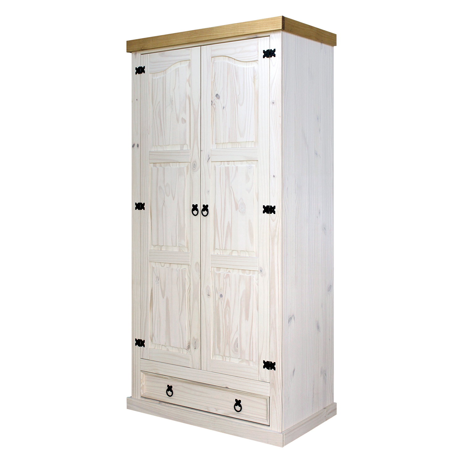 Skříň 2dveřová CORONA v provedení masiv borovice, voskovaná v bílém odstínu, s horní deskou voskovanou v medovém odstínu, bude skvělou volbou do ložnice, pokoje i šatny zařízené nábytkem CORONA v totožném barevném provedení. Skříň 2dveřová CORONA obsahuje šatní tyč a polici na klobouky, ve spodní části je velká zásuvka. Do praktické dvoudveřové skříně pověsíte všechno oblečení, na polici dáte doplňky a do zásuvky uložíte prádlo. Bílá skříň je zdobena černými s kovovými úchytkami a panty. Bílý masivní nábytek Corona v rustikálním designu vytvoří v každém prostoru dokonalou atmosféru.